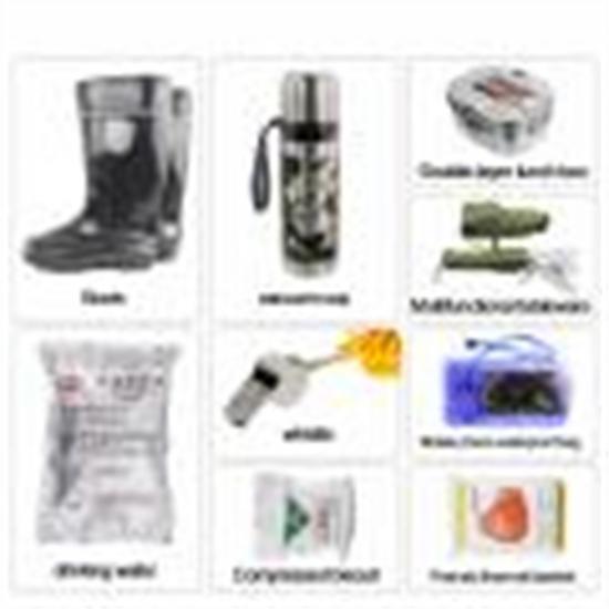 Machado, lanterna de 3 modos, cartão multifuncional, pulseira de sobrevivência, apito de tubo duplo, serra de arame, cabo de paraquedas, cobertor de emergência, kit de primeiros socorros completo, etc. |