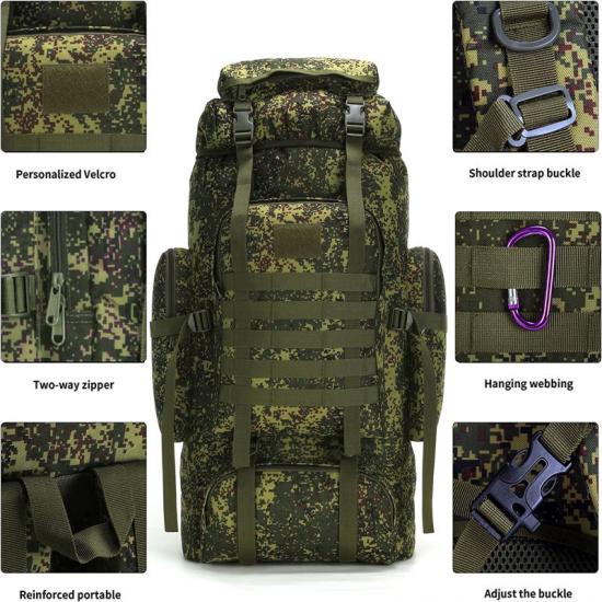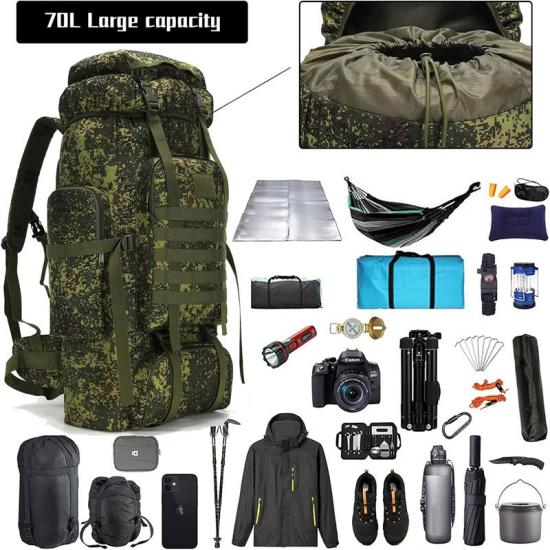 Mochila impermeável de 70L de boa qualidade e preços acessíveis, resistente a arranhõesEsta mochila é feita de tecido Oxford 900D de alta qualidade, durável e capaz de suportar cargas pesadas. Projetada com alças ergonômicas e painel traseiro acolchoado, garante o máximo conforto mesmo ao transportar cargas pesadas.