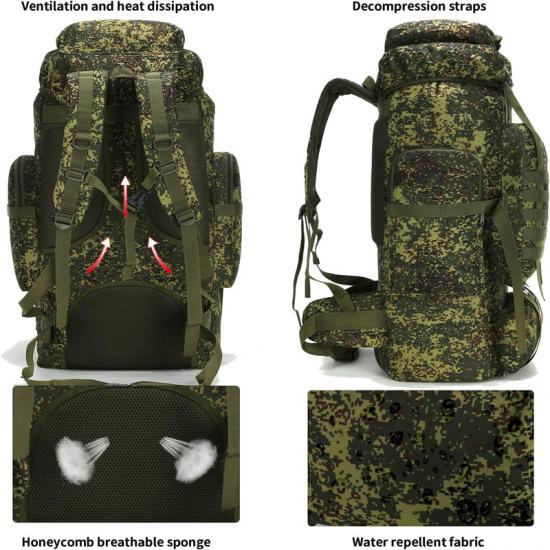 Esta mochila militar respirável de 70L é feita de tecido Oxford 900D, que não é apenas à prova d'água, mas também rasgável
