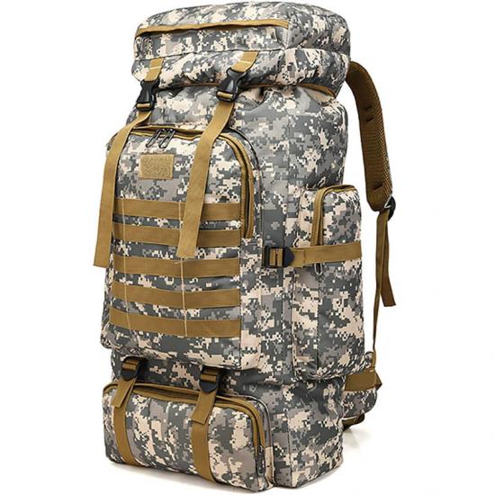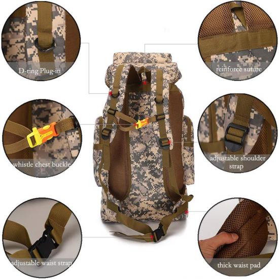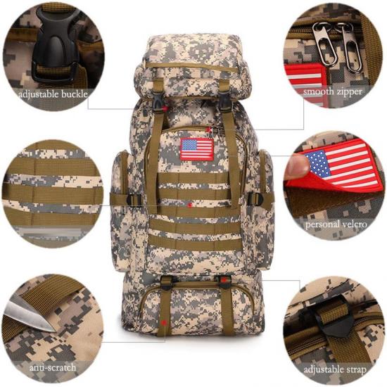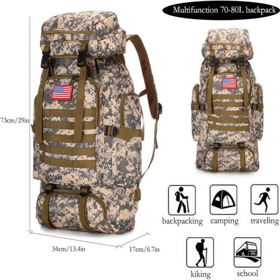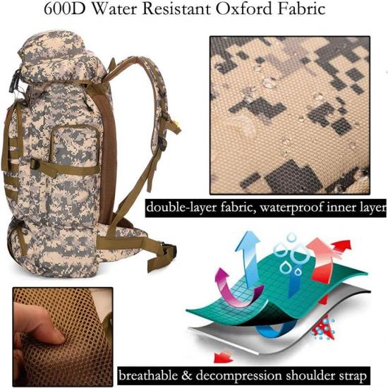 Esta mochila é feita de tecido Oxford 900D durável, que suporta cargas pesadas. Com capacidade de 70 litros, ela tem espaço suficiente para acomodar todos os seus equipamentos e itens essenciais.
