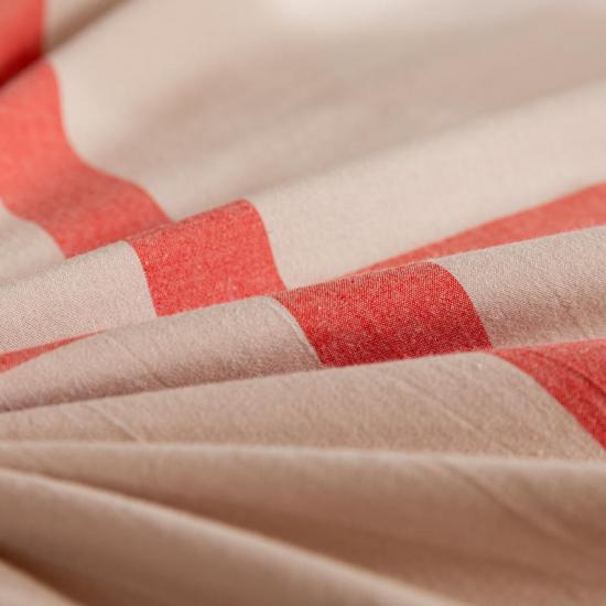 O conjunto de capa de edredom listrada é feito de tecido de poliéster liso. As lacunas entre as linhas são consistentes em tamanho e forma,