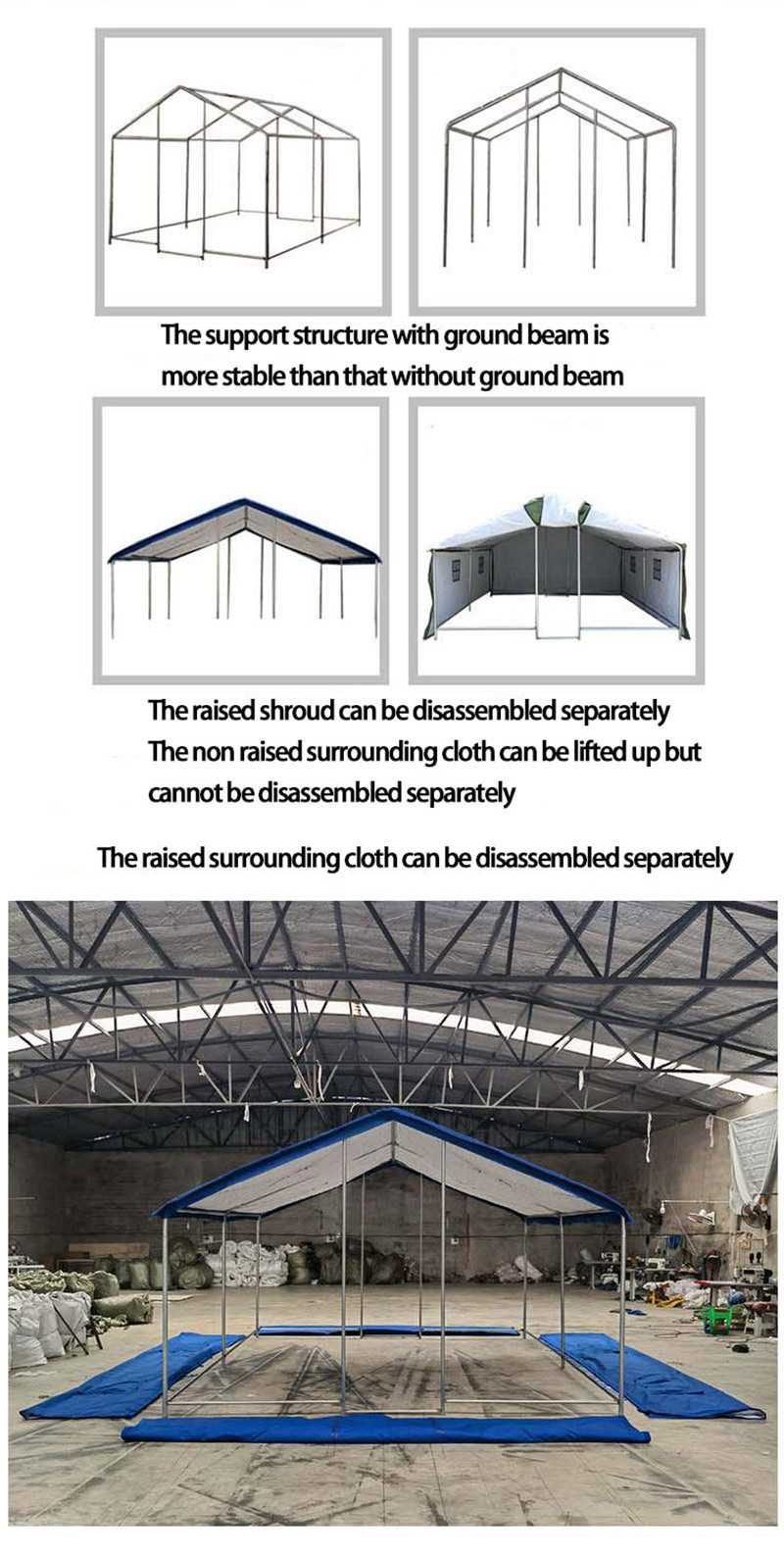 Tenda de Emergência, um recurso essencial em inúmeras situações críticas. Em situações de socorro emergencial em desastres, como furacões ou tsunamis, ela oferece abrigo imediato e seguro para os afetados. Militares contam com ela para acampamentos de mobilização rápida durante missões. Equipes médicas a utilizam como clínicas improvisadas para primeiros socorros e tratamento. Também é um item essencial em doações das Nações Unidas, reservas governamentais para preparação para desastres e operações da Cruz Vermelha. Esta tenda apresenta um design fácil de montar, permitindo uma instalação rápida mesmo nas circunstâncias mais urgentes. Além disso, está disponível em uma ampla gama de cores, permitindo que você escolha a que melhor se adapta às suas necessidades específicas. Sua construção de alta qualidade garante durabilidade e desempenho duradouro.