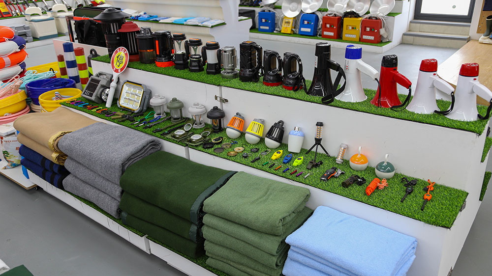 Disaster Relief Safety Helmet uses high-strength ABS material + built-in buffer layer, Disaster Relief Flashlight uses IPX8 waterproof design, Disaster Relief First Aid Kit uses 600D waterproof Oxford cloth material, complete equipment set suitable for flood rescue harsh environment, convenient for bulk storage management