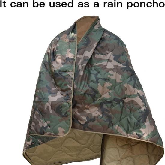 O cobertor tem um padrão de camuflagem de um lado e uma cor cáqui escura do outro. Em termos de dimensões, o forro de poncho de emergência se desdobra em aproximadamente 55 x 78,7 polegadas e pesa 1,63 libras com um saco de compressão correspondente. O cobertor pode ser embalado e totalmente comprimido em sua bolsa de compressão para fácil transporte e armazenamento, reduzindo espaço e volume.