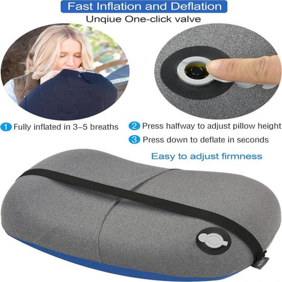 R: A válvula de entrada de ar do Travesseiro Inflável Macio Earthquake Disaster é equipada com um retentor acionado por mola que se fecha automaticamente ao ser inflado. Os usuários podem inflar o travesseiro pressionando um botão e ele se encherá em cerca de 3 a 5 respirações. Pressione o botão novamente para um esvaziamento rápido em poucos segundos.