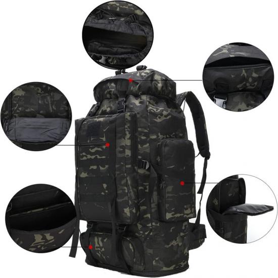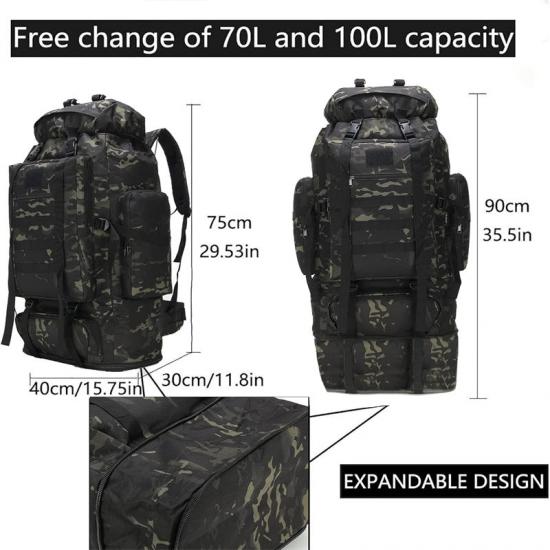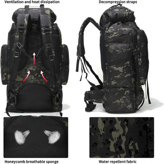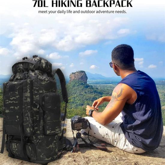 Esta mochila é feita de tecido Oxford 900D durável, que suporta cargas pesadas. Com capacidade de 70 litros, ela tem espaço suficiente para acomodar todos os seus equipamentos e itens essenciais.