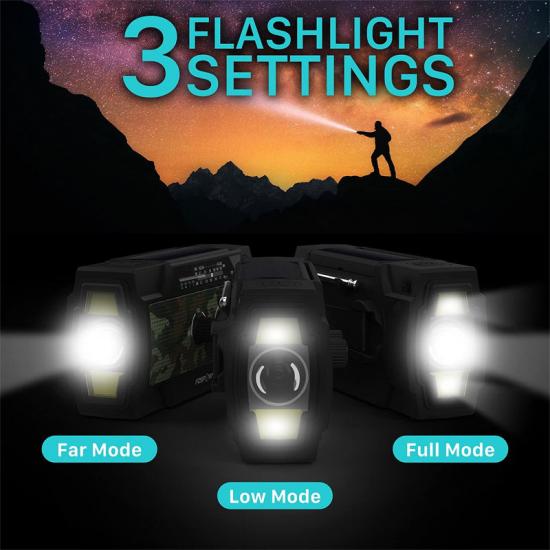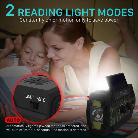 Mais do que uma ferramenta de comunicação, este Rádio de Emergência com 4 Luzes de Leitura de LED oferece duas opções de iluminação: 4 luzes de leitura de LED e um modo de lanterna de 1 W. Essas fontes de luz fornecem iluminação instantânea em caso de falta de energia ou falta de energia, mantendo você e sua família seguros.