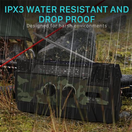 Rádio de Emergência Multifuncional com bateria interna de 2000 mAh, o Rádio de Emergência fornece energia para qualquer tablet ou celular pequeno e recebe com segurança as últimas previsões meteorológicas e notícias de emergência das estações de rádio NOAA e AM/FM. O Rádio de Manivela também possui 4 luzes LED e uma lanterna de 1 W para fornecer potência suficiente para manter você e seus entes queridos longe do escuro em caso de emergência.