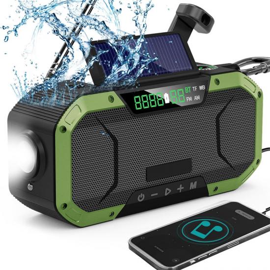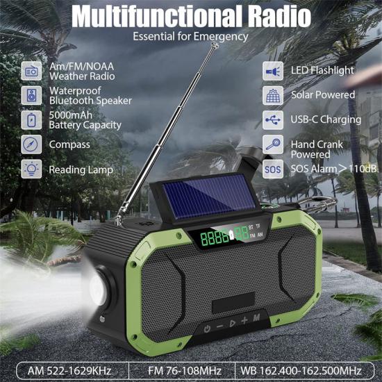 O Rádio Leve de Emergência não é apenas um rádio AM/FM tradicional, mas também um rádio meteorológico NOAA. Bateria recarregável de 5000mAh integrada. Com capacidade para até 36 horas de reprodução, este rádio de manivela possui 3 fontes de energia. O carregamento USB é a principal fonte de energia para o uso diário e, em emergências, você pode regenerar energia suficiente com a manivela e a energia solar.