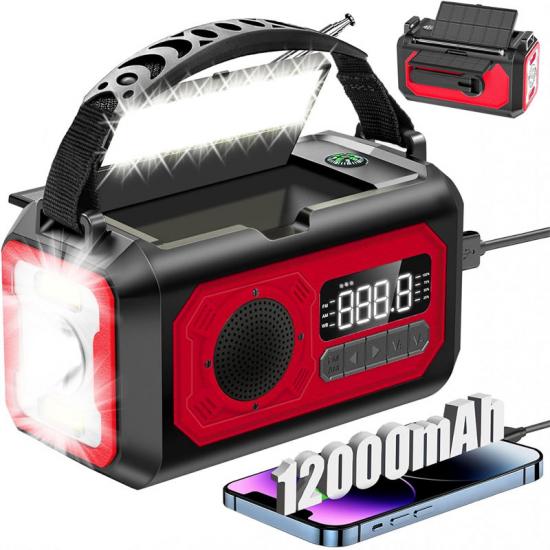 Bateria de alta capacidade com dois painéis solares: o Rádio de Alerta Meteorológico de Resposta a Emergências possui uma bateria interna de alta capacidade de 12.000 mAh, capaz de fornecer energia por um longo período. Além disso, é equipado com dois painéis solares, que podem ser recarregados rapidamente quando há luz solar suficiente para garantir que você possa manter a comunicação com o mundo exterior onde quer que esteja.