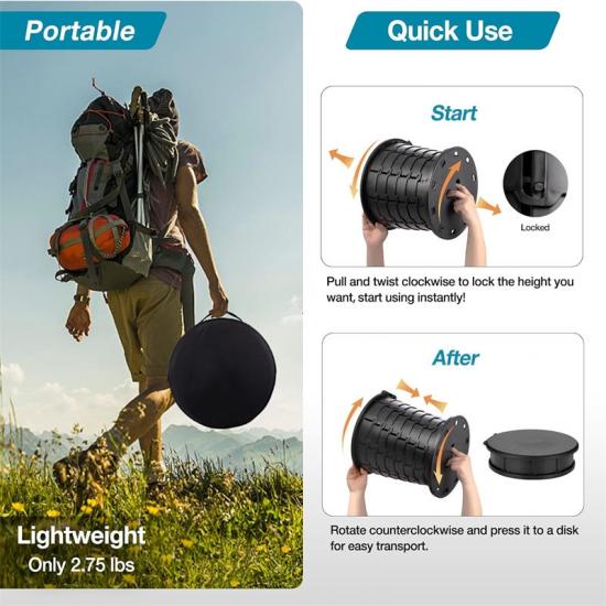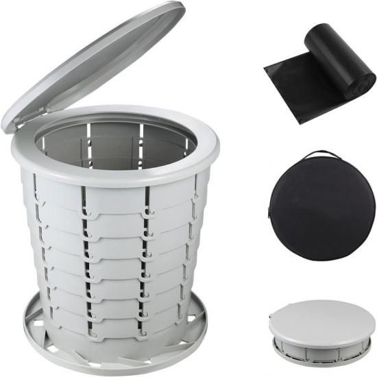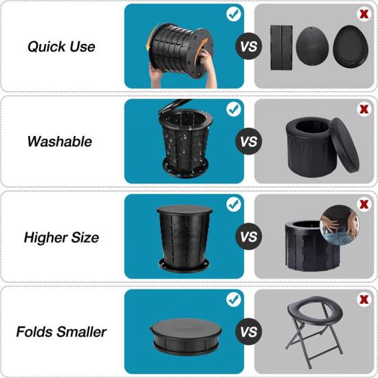 Este banheiro portátil de emergência compacto também apresenta um design multifuncional que permite que ele seja usado como banheiro de campanha, banco dobrável, caixa de armazenamento, mesa lateral ou lata de lixo, alternando livremente entre tampas funcionais. Essa versatilidade o torna extremamente útil em diferentes cenários.