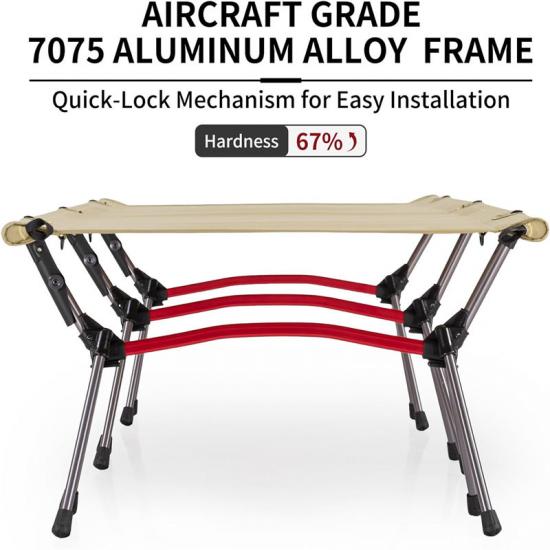 A estrutura da nossa Cama Dobrável para Suprimentos de Emergência de 2,1 kg é cuidadosamente confeccionada em liga de alumínio 7075 de alta qualidade, de nível aeronáutico, um material amplamente reconhecido por suas propriedades leves e robustas. Ela suporta facilmente toda a estrutura da cama, garantindo estabilidade e segurança durante o uso. A superfície da cama é feita de tecido Oxford 600D respirável e resistente a rasgos, que não só é durável e resistente ao desgaste, como também possui boas propriedades de proteção contra umidade e retenção de calor, garantindo que você possa desfrutar de uma experiência de sono confortável em diversos ambientes.