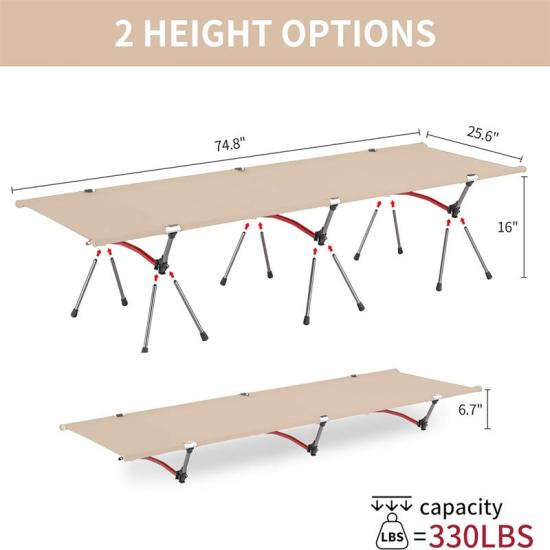 Nossa Cama Dobrável Portátil Emergency Supplies está equipada com uma variedade de funções práticas. Primeiramente, possui 2 opções de altura: a altura baixa de 17 cm é adequada para uso em barracas ou em solo firme, enquanto a altura alta de 40 cm é adequada para uso em terrenos gramados, lamacentos e úmidos, projetada para se adaptar a todos os tipos de terrenos complexos e garantir um sono tranquilo e sem preocupações. Em segundo lugar, a cama possui um sistema de travamento rápido que facilita o destravamento e o travamento com apenas uma mão, para maior comodidade. Além disso, a cama é equipada com tubos de corda com amortecimento de impacto, o que não só aumenta a estabilidade da cama, como também torna o processo de instalação e remoção mais fácil e menos trabalhoso.