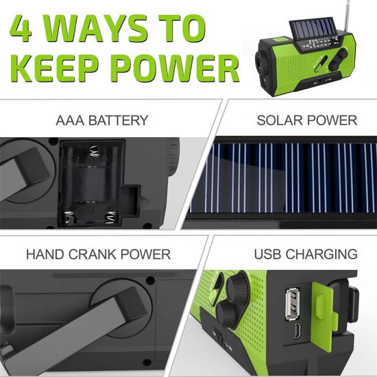 O Rádio de Sobrevivência de Emergência Confiável oferece quatro opções de energia, incluindo carregamento por cabo USB, geração de energia por manivela, alimentação por painel solar e bateria reserva AAA. Isso significa que, não importa onde você esteja no mundo, você pode ter certeza de que o rádio funcionará corretamente e nunca perderá a conexão.