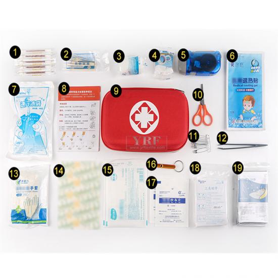 Lenços umedecidos * 10 peças/saco, Máscara * 5, Bandagem triangular * 1, Lençol de algodão iodóforo * 10, Comprimidos de álcool * 20, Adesivo antipirético * 1, Tira elástica fina de PBT * 1, Máscara de RCP * 1, Essência de óleo para vento * 1, Almofada de gaze * 2, Fita adesiva * 1, Adesivo de bandagem * 12, Cotonete * 1, Alfinete de segurança * 10, Pinça 1, Torniquete * 1, Tesoura * 1, Pacote educativo urgente * 1