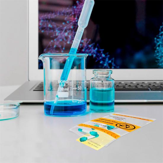Utilizando material composto LDPE+HDPE de grau alimentício, espessura de até 3,5 MIL, passando no teste de biocompatibilidade ISO 10993-5 sem citotoxicidade, transparência de até 93%, facilitando a observação da cor da amostra, precipitação e outras características.