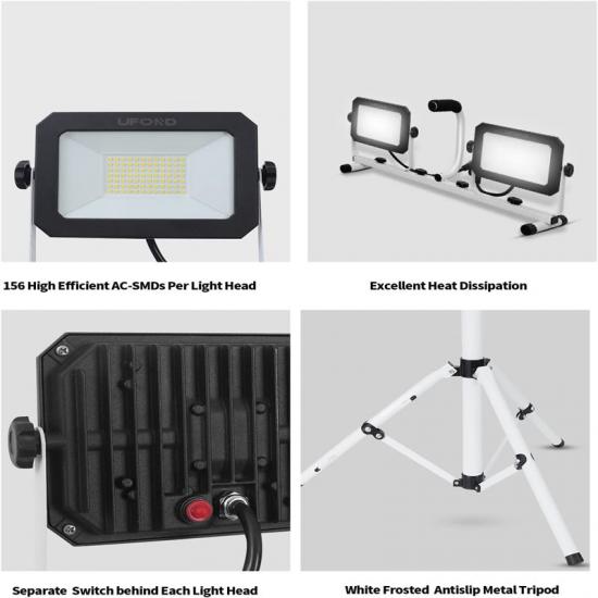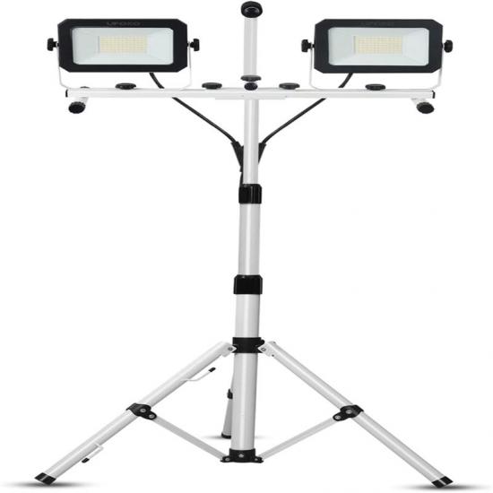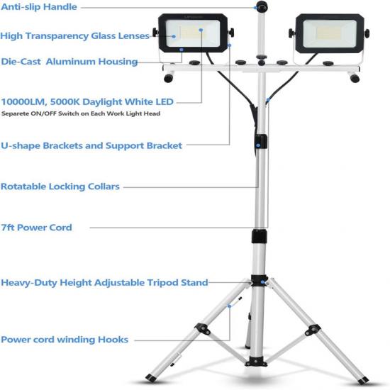 A luz de emergência possui 5000 lúmens por tampa e flash de luz branca de 5000K. O tripé telescópico se estende de 33" a 70". Cada cabeça pode ser girada 360° horizontalmente e inclinada 270° verticalmente para ajustar o ângulo de iluminação desejado. A luz de trabalho de cabeça dupla com alça pode ser removida para uso independente, eliminando a necessidade de um tripé.