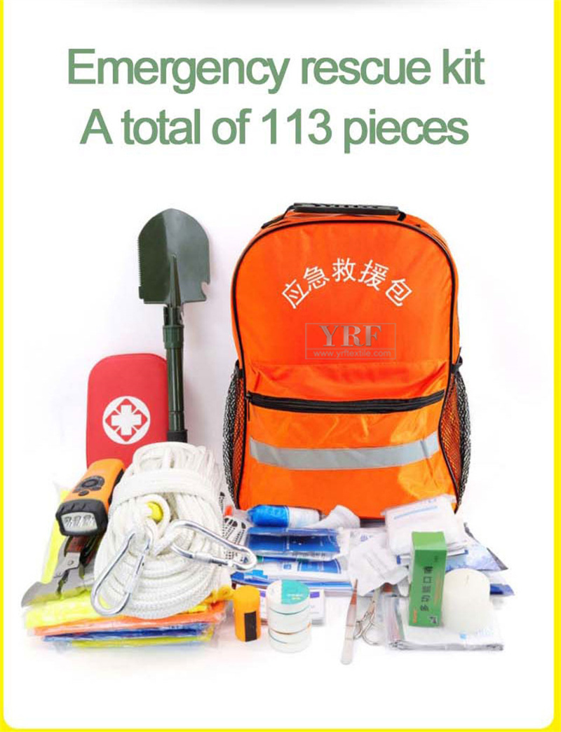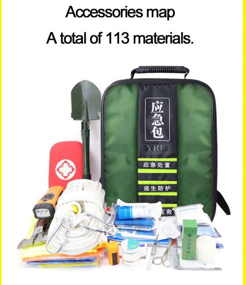 Machado, lanterna de 3 modos, cartão multifuncional, pulseira de sobrevivência, apito de tubo duplo, serra de arame, cabo de paraquedas, cobertor de emergência, kit de primeiros socorros completo, etc. |