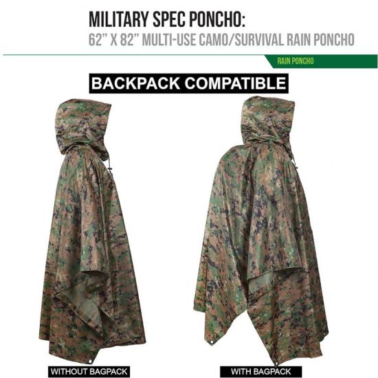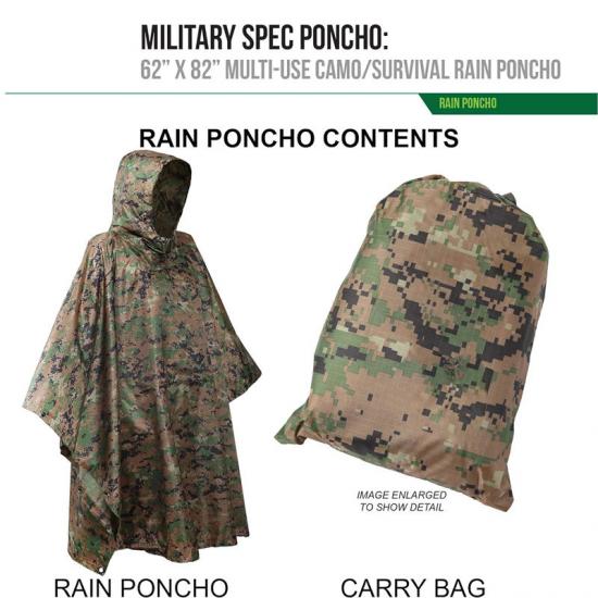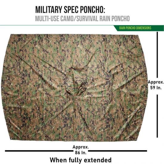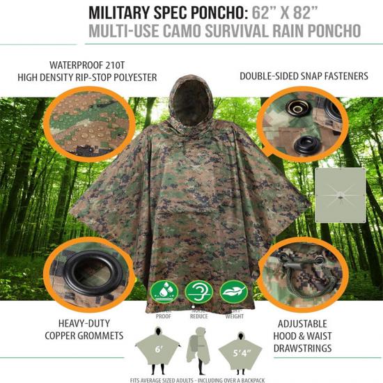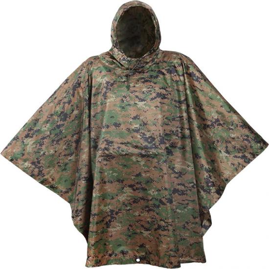 Em segundo lugar, em cenários de uso militar, o isolamento do forro da capa de chuva não só fornece proteção contra chuva, mas também pode ser usado como uma ferramenta de ocultação. Seu tecido revestido de poliéster ripstop e poliuretano de alta densidade proporciona excelente desempenho à prova d'água, ao mesmo tempo que reduz atrito e ruídos agressivos. A facilidade de transporte e ajuste do poncho também o tornam ideal durante operações táticas.
