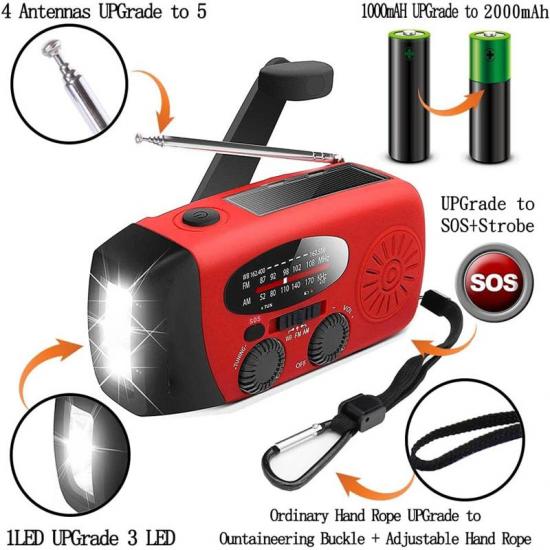 R: Este rádio de engenharia fornecido pela Cruz Vermelha pode receber 7 canais de rádio meteorológico NOAA, tem 3 lanternas de emergência LED integradas, um kit de sobrevivência de emergência com um chip estroboscópico SOS+, indicador de carga solar e luz de sinalização de canal.