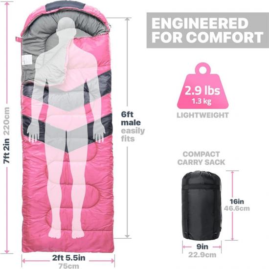 Nossos sacos de dormir são feitos de 100% poliéster, medem 220 cm x 80 cm e pesam apenas 1,3 kg. Sacos de dormir de alta qualidade são adequados para uso na primavera, verão, outono e clima frio, classificados para temperaturas de 40°F a 77°F, com uma temperatura de conforto ideal de 62°F a 75°F.