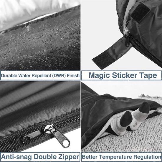 O saco de dormir normal usa o zíper do lado esquerdo e o saco de dormir espaçoso usa o zíper do lado direito. O zíper do lado esquerdo permite que você feche o saco de dormir normal com o saco de dormir largo com o zíper do lado direito para formar uma cama de casal; o saco de dormir duplo pode ser aberto para formar dois sacos de dormir separados. Nosso saco de dormir 290T da Doação das Nações Unidas pode ser deixado aberto como um cobertor em noites quentes e apertado quando a temperatura cai. Essas características tornam nossos sacos de dormir perfeitos para socorro emergencial em desastres, resgate de emergência e outros cenários que exigem combinações e ajustes rápidos.