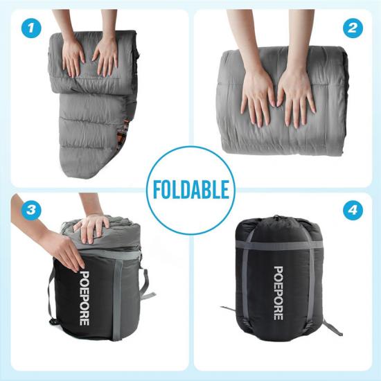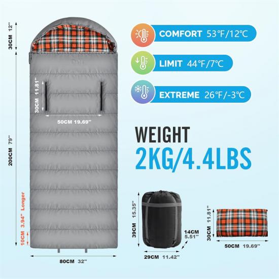O saco de dormir é preenchido com algodão oco, que é leve, quente, respirável e proporciona uma experiência de sono termostática. O saco de dormir de poliéster de 4,4 libras tem uma temperatura confortável de 53-60 ℉, adequado para todas as condições climáticas.
