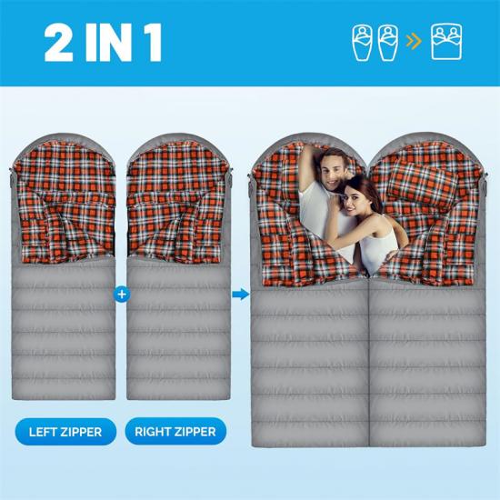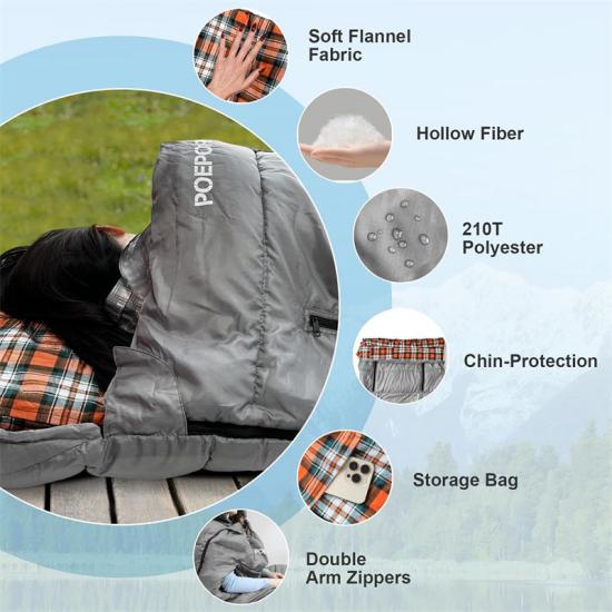 Nosso saco de dormir impermeável (79+12)*32 polegadas/(200+30)*81 cm) é feito de tecido xadrez de poliéster 210T impermeável de alta qualidade para o tecido externo, o que lhe confere excelente resistência a respingos e mantém você seco mesmo em condições climáticas adversas. O tecido interno, por outro lado, é feito de tecido facial macio e aconchegante, o que garante um sono confortável mesmo em noites frias.