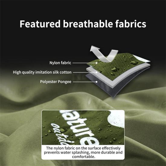 Material de saco de dormir de defesa respirável: Nossos sacos de dormir são feitos de náilon e poliéster de alta qualidade, que são resistentes, duráveis e fáceis de limpar. Nosso enchimento é feito de algodão sintético de 80 g/m², o que proporciona uma experiência de sono confortável e também economiza muito espaço.